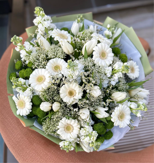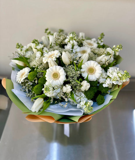 Elegant and pure, Whispers of White is a timeless arrangement that captures the beauty of simplicity. Featuring a graceful selection of white roses, carnations, tulips, and seasonal blooms, this bouquet exudes calm, sophistication, and heartfelt sincerity. Wrapped in soft white paper, it’s a perfect gesture for weddings, sympathy, or any occasion that calls for a touch of refined grace.