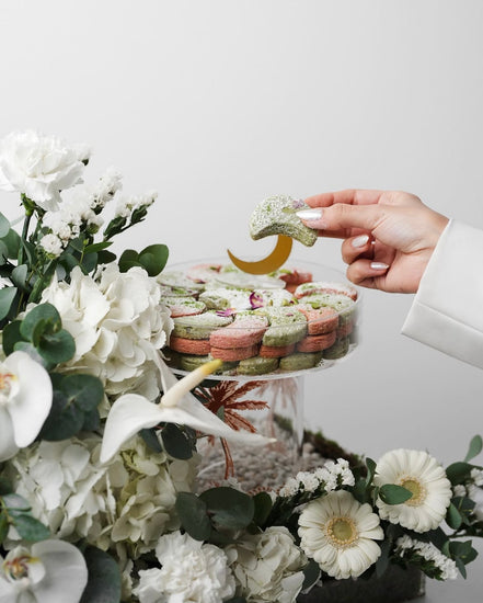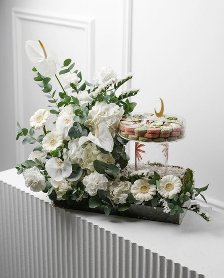 A serene celebration of elegance — this arrangement pairs lush white blooms, including orchids, hydrangeas, and anthuriums, with fresh greenery for a soft, luxurious feel. Beside it, a crystal-clear stand displays an artful selection of pistachio and rose macarons, dusted with sugar and crowned with a golden crescent moon.