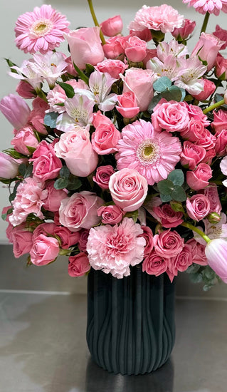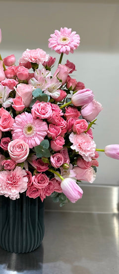 Overflowing with blush roses, tulips, carnations, and gerberas, the Pink Reverie Vase is a grand expression of love and elegance. A statement arrangement that speaks volumes, perfect for any romantic or celebratory occasion.