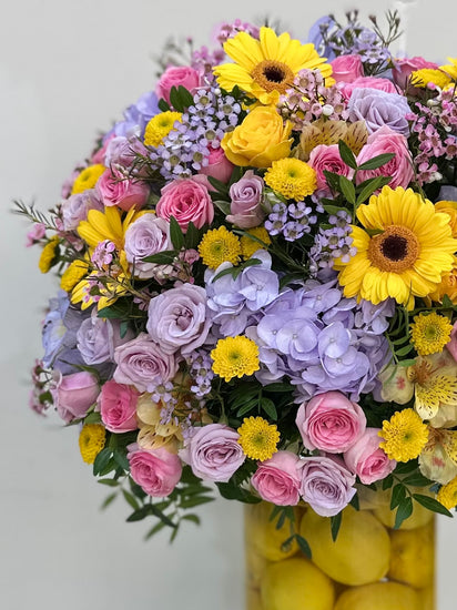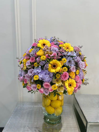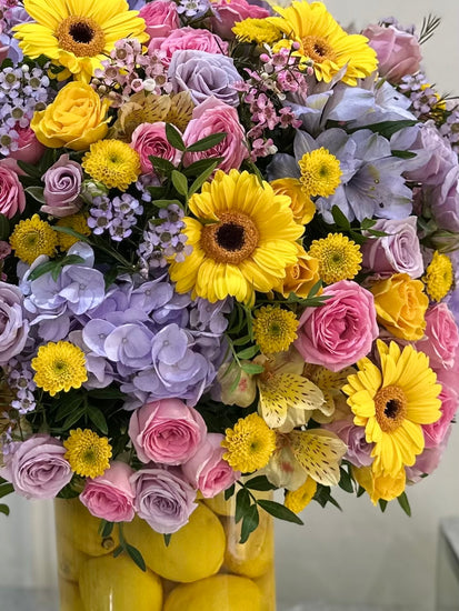 Sunny yellow-and-lemon tones to brighten any day. This arrangement features lemon yellow gerberas